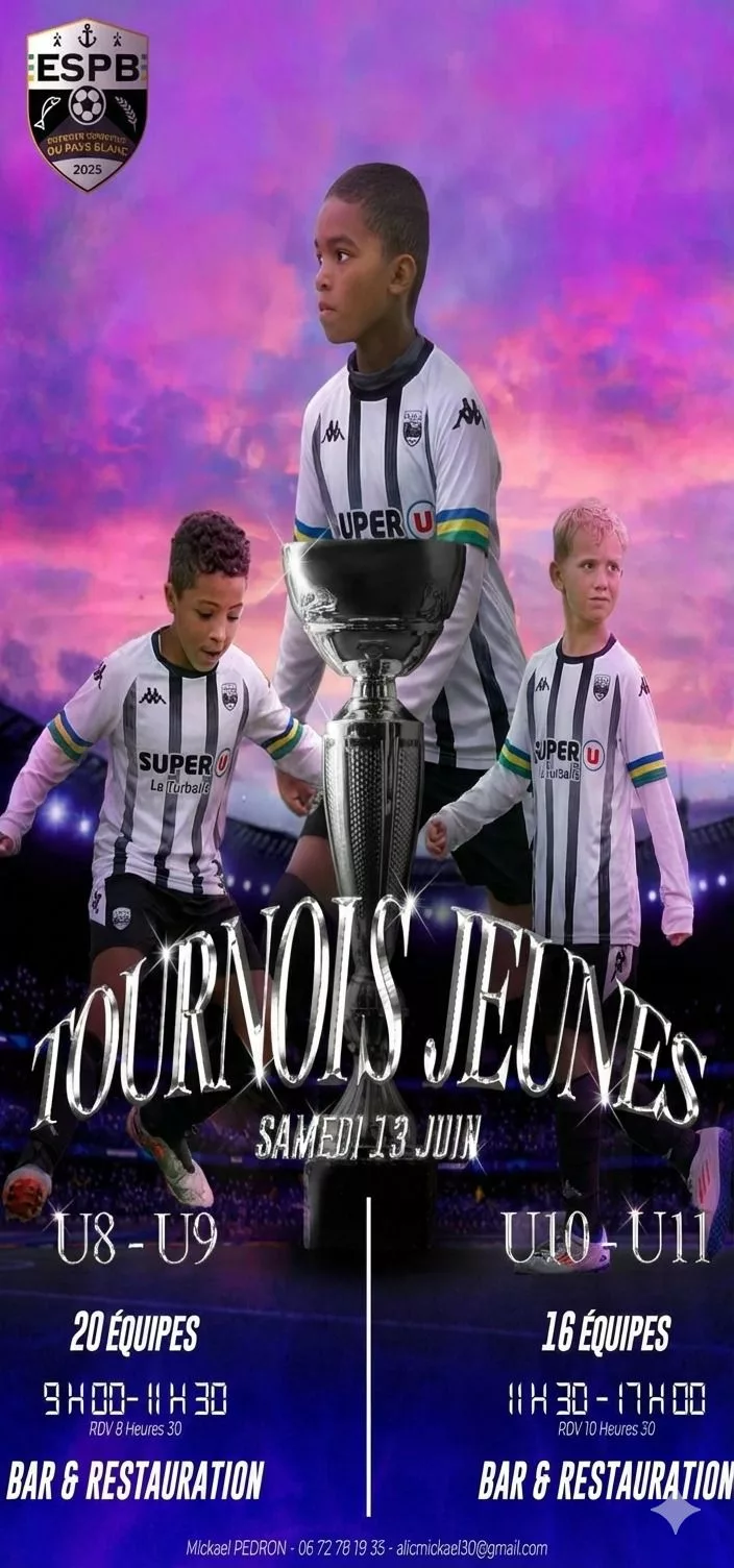 Nous organisons nos tournois jeunes le 𝐬𝐚𝐦𝐞𝐝𝐢 𝟔 𝐣𝐮𝐢𝐧 (U7 et U13) et le 𝐝𝐢𝐦𝐚𝐧𝐜𝐡𝐞 𝟕 𝐣𝐮𝐢𝐧 (U9 et U11). N’hésitez pas à vous inscrire dès maintenant pour passer une journée sous le signe du foot, de la bonne humeur et des copains/copines ! Pour obtenir des informations ou vous inscrire, contactez : Bastien GIROT