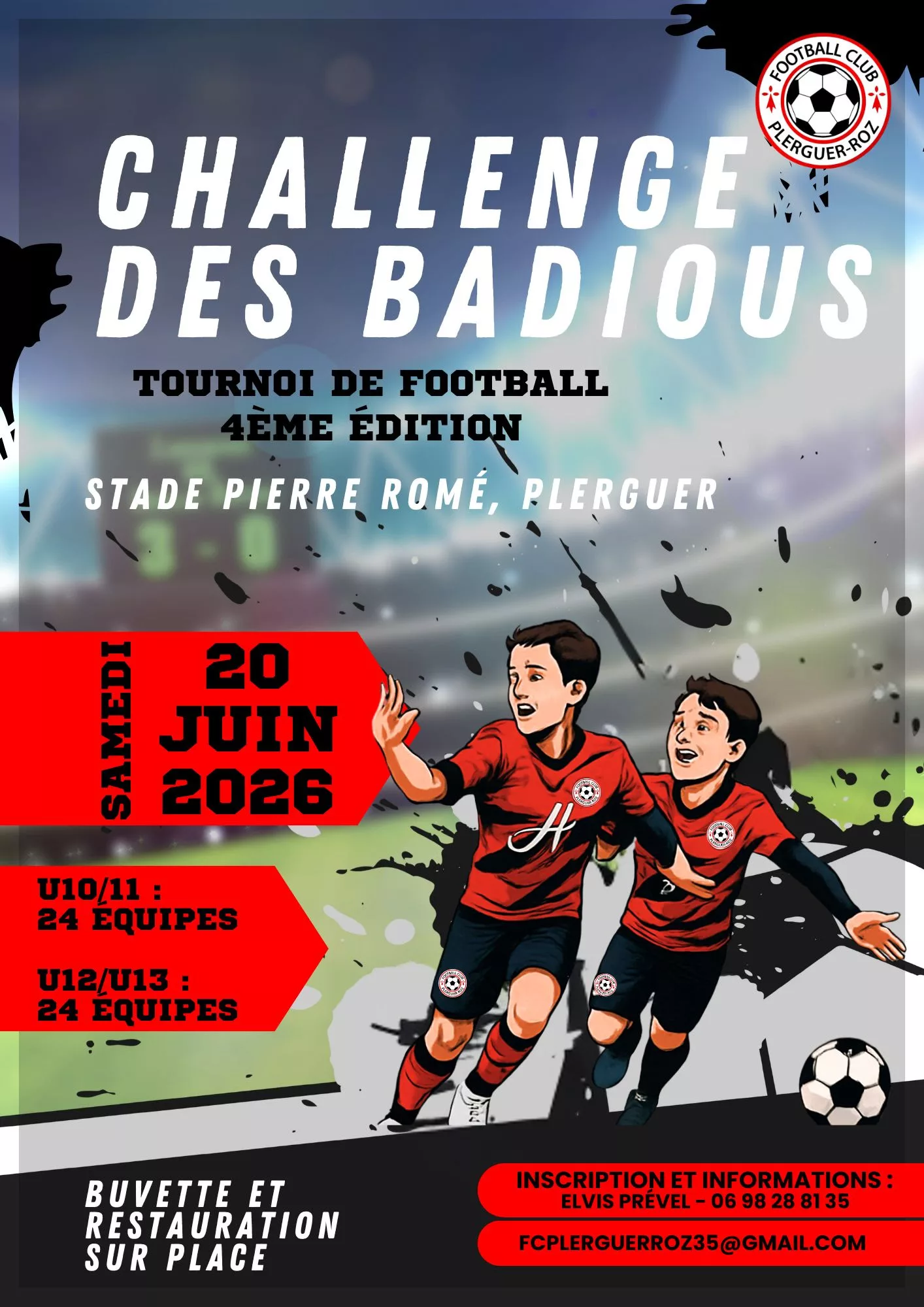 OUVERTURE DES INSCRIPTIONS ! Les Challenges U7–U9 et le Tournoi Jeunes semi-nocturne U11–U15 sont officiellement lancés pour l’édition 2026. Rendez‑vous les 27 & 28 juin 2026 pour deux jours de football, de fair‑play et d’ambiance comme on les aime. Infos & réservations : toutes les modalités sont indiquées sur l’affiche ci‑jointe.Les places partent vite… pensez à inscrire votre […]