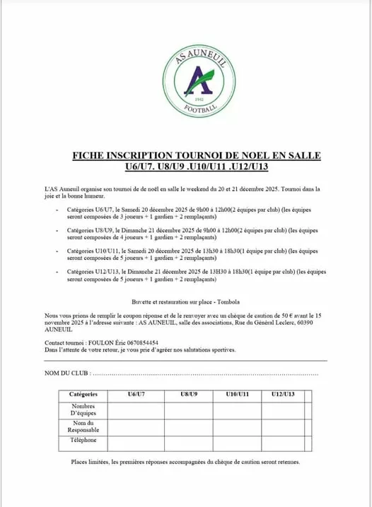 Bonjour à tous, Comme chaque année le joli tournoi de Noël d'Auneuil se déroulera le samedi 20 et le dimanche 21 décembre 2025 . Venez avec vos petits champions prendre du plaisir et repartir avec des souvenirs pleins la tête . Les equipes seront acceptées si le bons de réservation est complet et que le […]