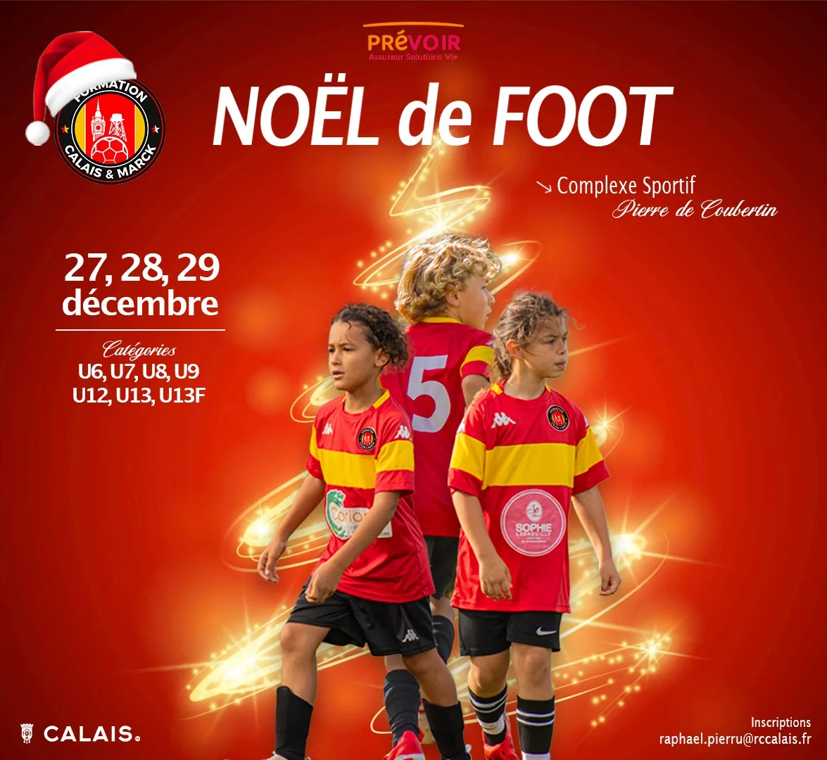 La Formation Calais Marck est fière de vous annoncer le 𝗡𝗼𝗲̈𝗹 𝗱𝗲 𝗙𝗼𝗼𝘁 𝟮𝟬𝟮𝟱 ! Voici les catégories ainsi que les dates sur l’ensemble du tournoi : Samedi 27 décembre :> Matin : U6/U8> Après-midi : U7/U9 Dimanche 28 décembre :> U12 + U13F Lundi 29 décembre :> U13Pour toute demande de dossier d’inscription : raphael.pierru@rccalais.fr / 06.80.63.51.07