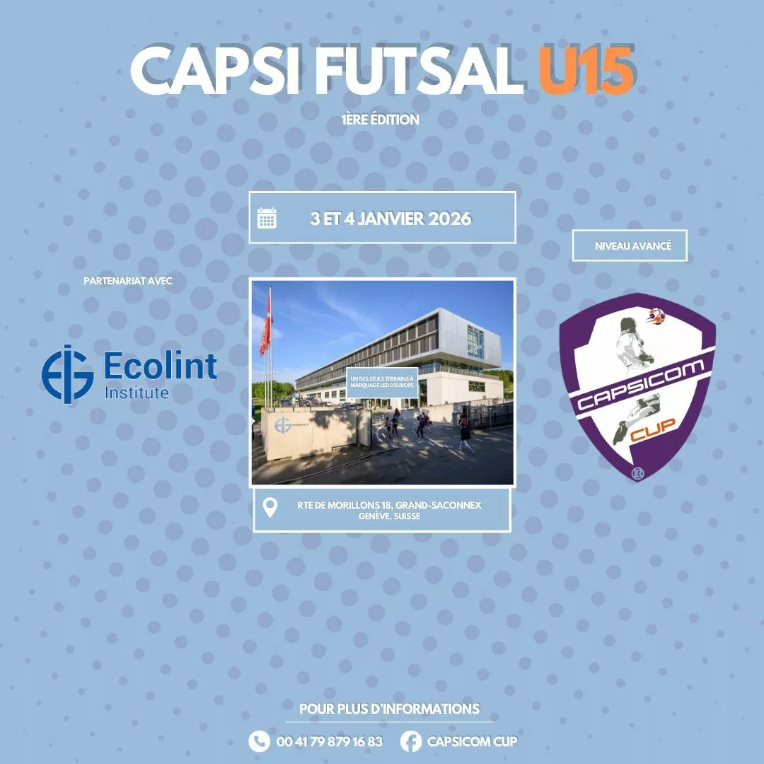 Genève Genève, SwitzerlandCapsi Futsal U15 – 1ʳᵉ édition !Face à la forte demande, on lance enfin le tournoi U15.Et ça se jouera sur l’un des seuls terrains à marquage LED d’Europe, le seul en Suisse