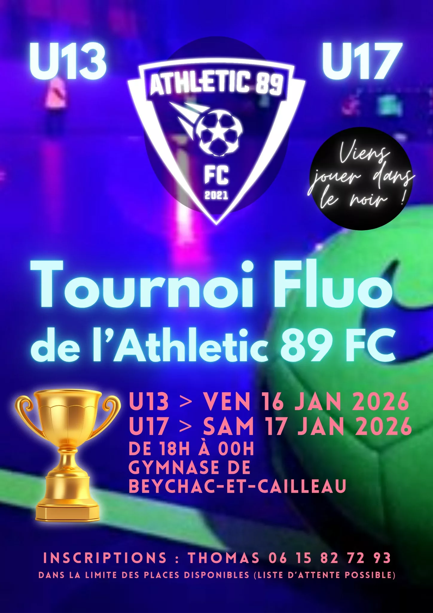 Bonjour, reste des places Tournoi Fluo dans le noir (U13 vendredi 16 et U17 samedi 17 janvier) à Beychac-et-Cailleau (33) Buvette et restauration sur place Ambiance garantie !