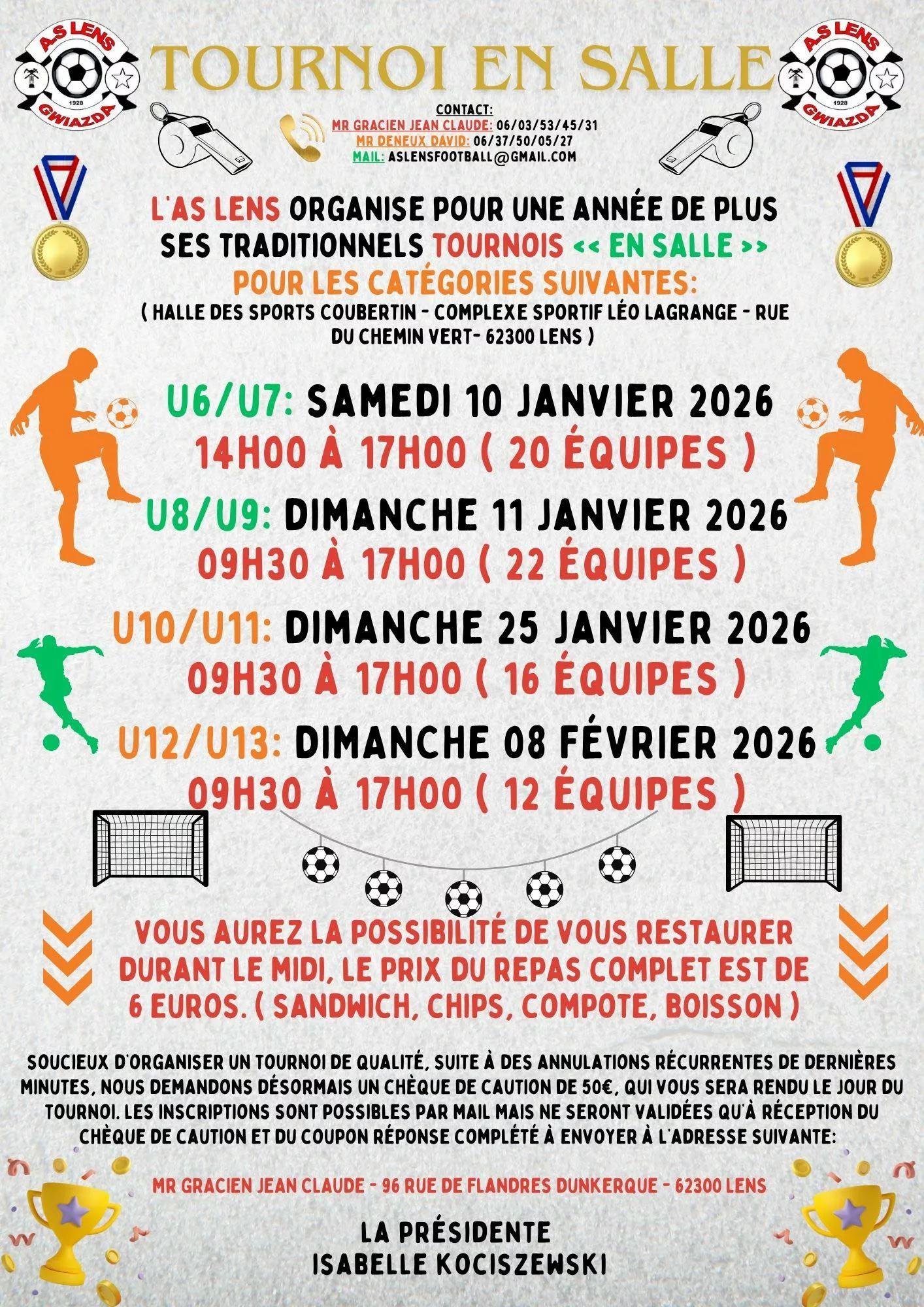 L'AS Treport Football comme Chaque Saison , Organise son Traditionnel Tournoi En Salle U7 le Samedi 3 Janvier à 13h00 U13 le Dimanche 4 Janvier à 10h00 U9 le Samedi 10 Janvier à 13h00 U11 le Dimanche 11 Janvier à 10h00 06.67.46.62.29 Alexis Lavacry AS Treport Football