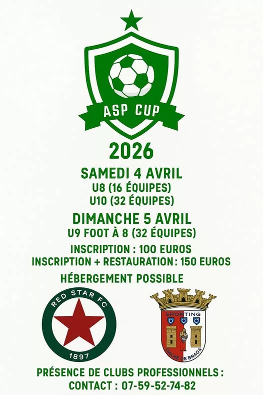 Catégories U8-U9-U10 Venez vivre l’expérience ASP CUP à Pignan lors du week-end de Pâques 2026. Samedi 4 Avril 2025 : U8 ( 16 équipes ) U10 (32 équipes ) Dimanche 5 Avril 2025 : U9 foot à 8 ( 32 équipes ) Présences des clubs professionnels déjà confirmées : - Red Star - Sc Braga […]