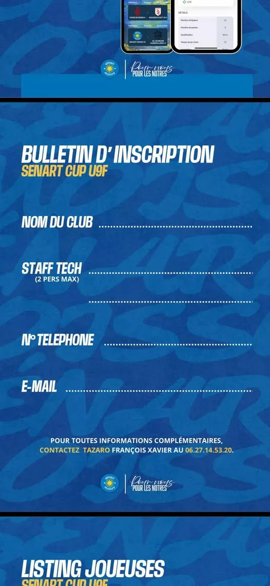 Nous organisons notre tournoi U9F futsal le dimanche 22 février 2026. Il nous reste encore quelques places. Avec la participation du PSG, PFC ou encore L’AS St Priest. Tous nivaux sont acceptés Format : 4 + 1 gardienne 3 remplaçantes Vous pouvez m’envoyer la fiche d’inscription au : 06.50.45.36.19 Lylou Senart - Moissy |