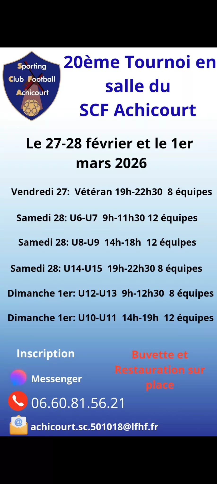 Bauvin Bauvin, FranceSamedi 27 & Dimanche 28 Décembre Organisé par le FC Bauvin Programme : Samedi U11 : 9h - 12h U13 : 13h30 - 17h Présence exceptionnelle de l’équipe U9 du LOSC Dimanche U8/U9 : 9h - 12h U10 : 13h30 - 17h Vétérans : 19h - 21h30 Ambiance, passion et fair-play garantis Venez nombreux encourager vos équipes et partager un super week-end foot ! Contact : David Lallemant